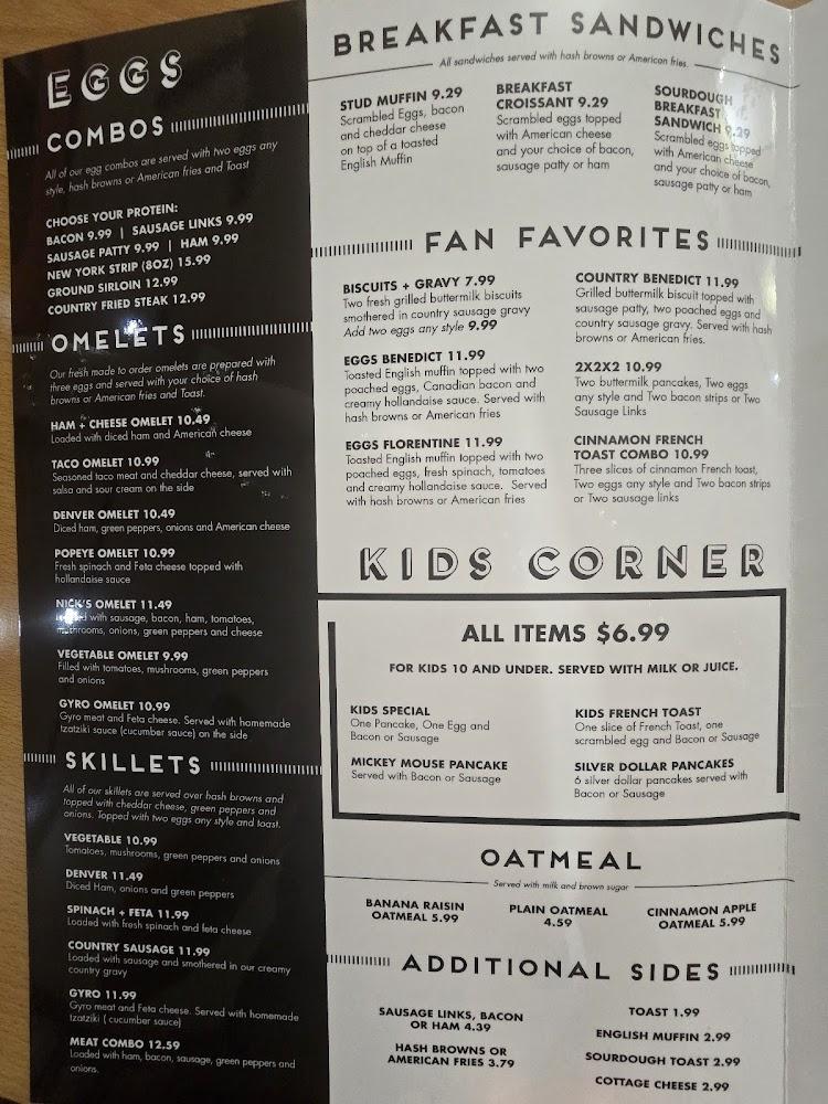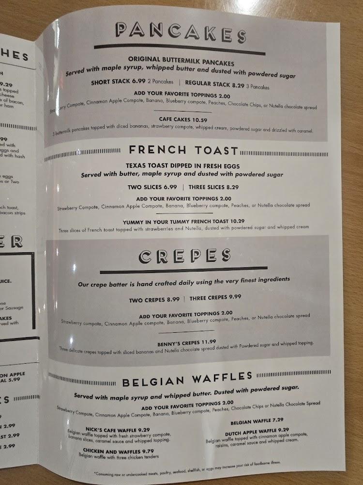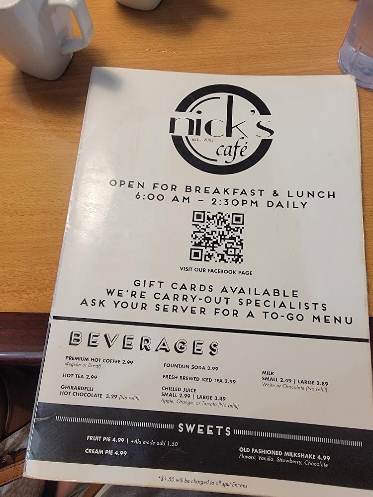 Nick's Cafe's menu offers an extensive selection that caters to all palates. The breakfast menu includes mouthwatering classics like fluffy pancakes, hearty skillets, and various omelets. Signature dishes, such as the Cinnamon French Toast Combo, never fail to impress.